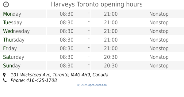 It is also possible to : Edit these OPENING HOURS of Restaurant Harveys In Toronto, 101 Wicksteed Ave,