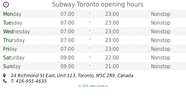 It is also possible to : Edit these OPENING HOURS of Restaurant Subway In Toronto, 24 Richmond St East, Unit 113,